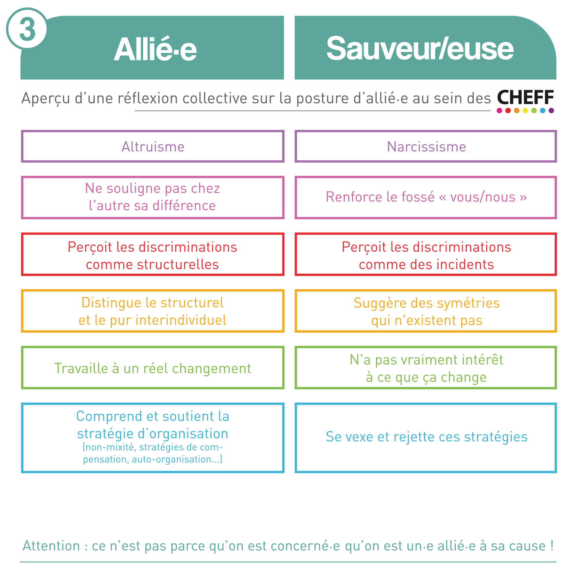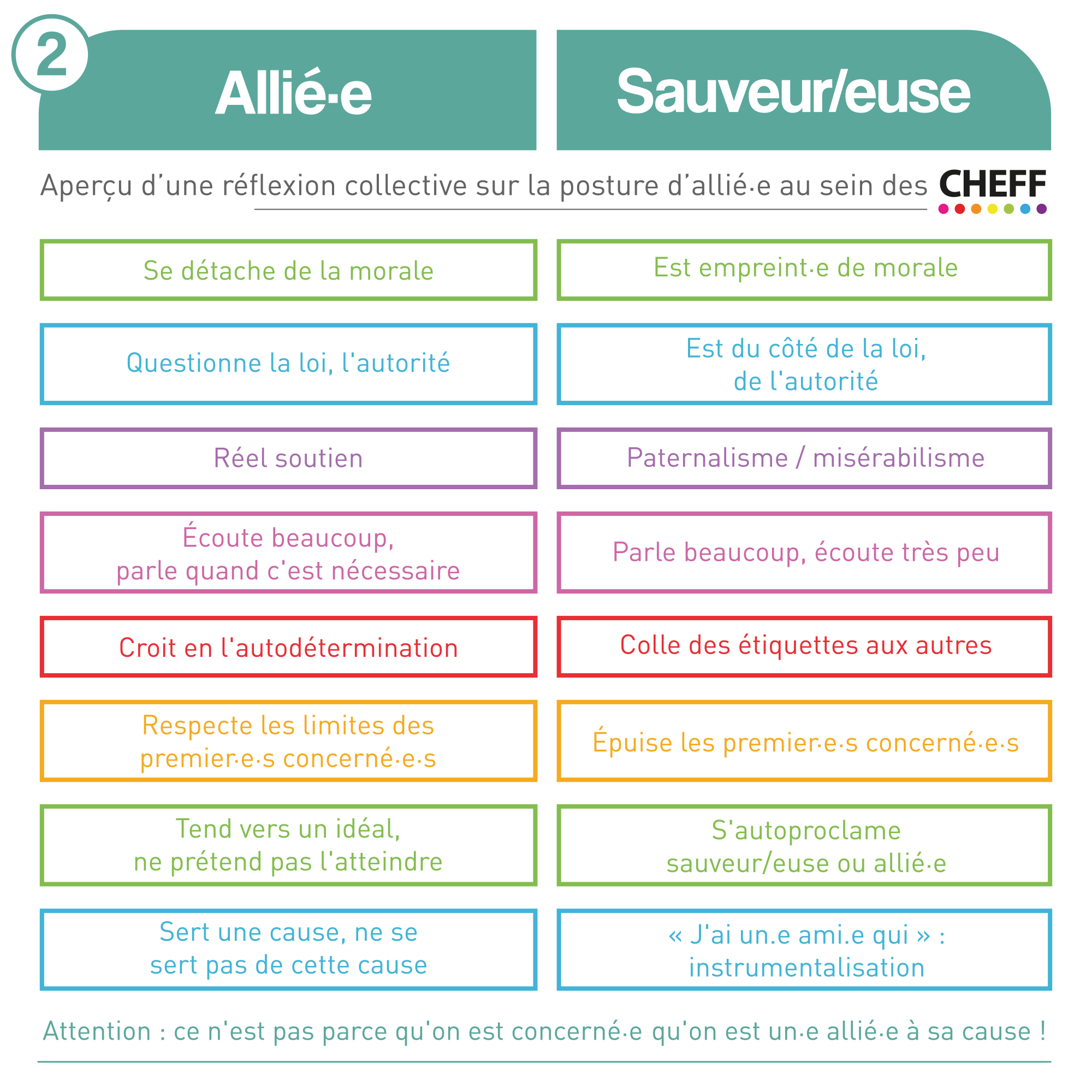 Pour y voir plus clair, voici de manière synthétique comment les jeunes des CHEFF distinguent la posture idéale (celle de l’allié.e) et la posture too much (celle du/de la sauveur/euse). Cela s’applique à la lutte contre les LGBTQIphobies, mais est facilement transposable à d’autres combats.