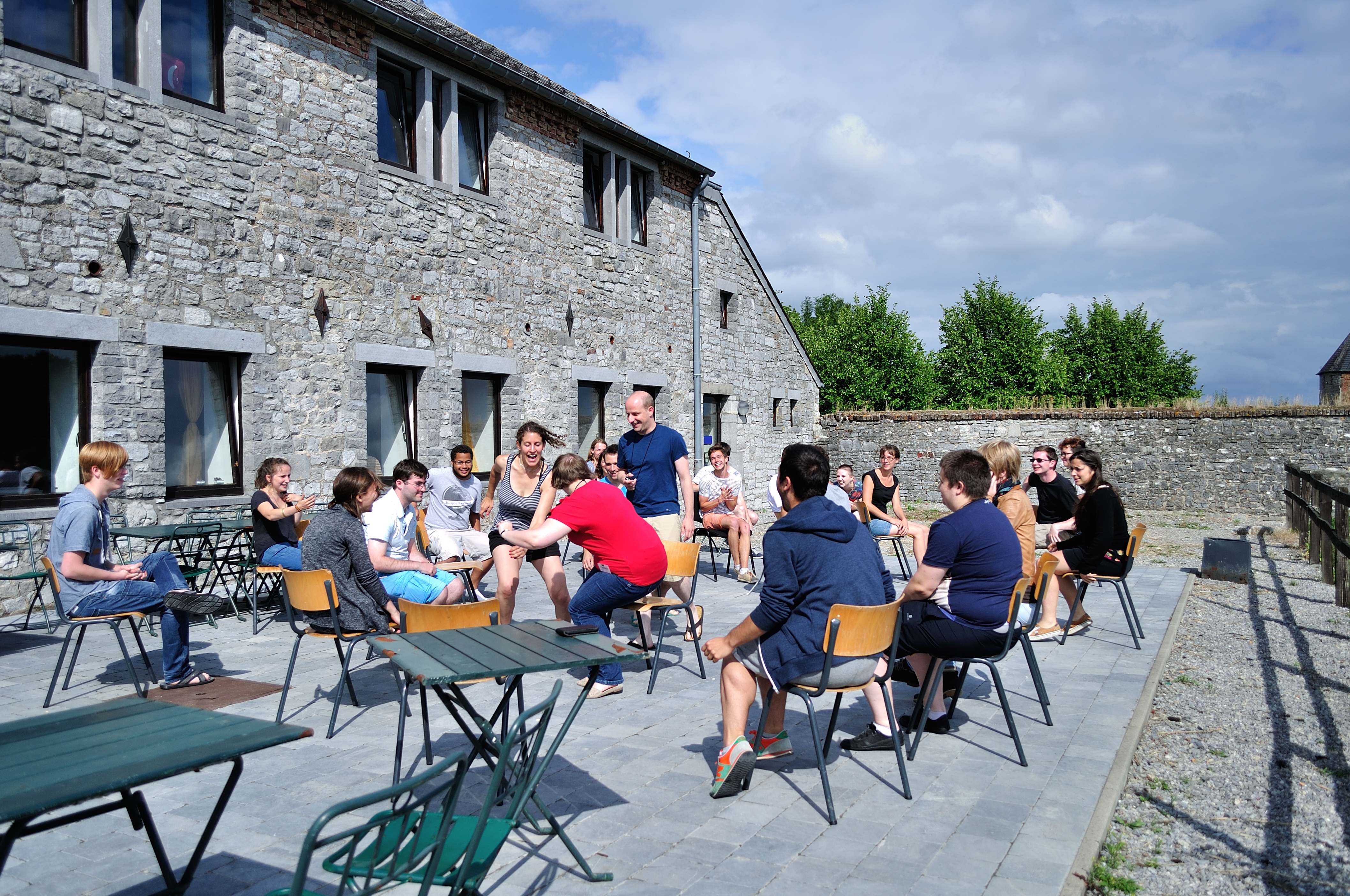 Nous commençons fort cette mise au vert avec un faux départ pour la plupart d’entre nous, dû à une grève de la SNCB. Mais nous ne nous laissons pas abattre et nous arrivons à bon port, c’est-à-dire Dinant, où une nouvelle épreuve – sportive cette fois – nous attend : un jeu de piste de plusieurs kilomètres jusqu’au gîte. Nous sommes sur le point de perdre plusieurs compagnons durant celui-ci, mais nous survivons grâce à une pomme et de l’eau, sans oublier le superbe paysage qui nous redonne espoir. Après ce qui semble être une éternité pour certains, nous arrivons à la ferme, accueillis par une équipe déjà fort enthousiaste au commencement de ce long week-end. Une fois tous présents, l’énigme des cartons de couleur reçus à la gare trouve réponse : chaque couleur correspond à un groupe pour la répartition des tâches. Ainsi, les équipes se forment, composées de membres des différents cercles, et se trouvent un nom original. Ce premier exercice permet de délier les langues et d’installer une ambiance conviviale, avant de passer aux choses sérieuses. La première activité de cette mise au vert permet à ceux qui ne connaissent rien du tout aux CHEFF d’en apprendre